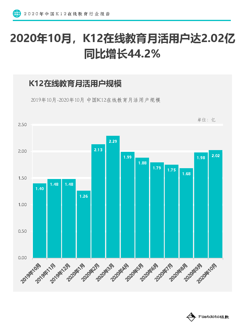 受新冠疫情影響,2020年(nián)在線教育行業迎來爆發式增長(cháng),K12在線教育也直接受益于後疫情時代的(de)增長(cháng)紅(hóng)利,2020年(nián)10月K12在線教育活躍用戶達2.02億人,同比增長(cháng)44.2%。