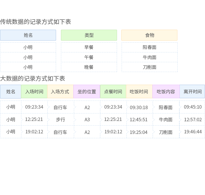 随着“三通兩平台”建設和(hé)應用深化,産生了大量數據,其中部分數據具有數據量巨大、變化快、多樣化特征,适用于大數據辦法來處理(lǐ),我們稱為(wèi)教育大數據。比如(rú):通過一(yī)卡通采集的(de)學(xué)生消費數據,傳統數據隻記錄姓名、類型和(hé)食物,大數據還記錄入場時間、點餐時間、吃飯時間、離(lí)開時間等內(nèi)容。
